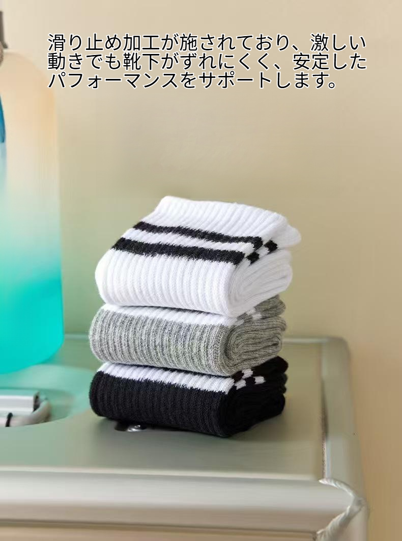 ● 滑り止め加工が施されており、激しい動きでも靴下がずれにくく、安定したパフォーマンスをサポートします。